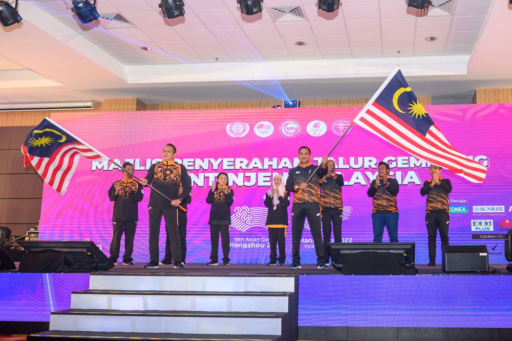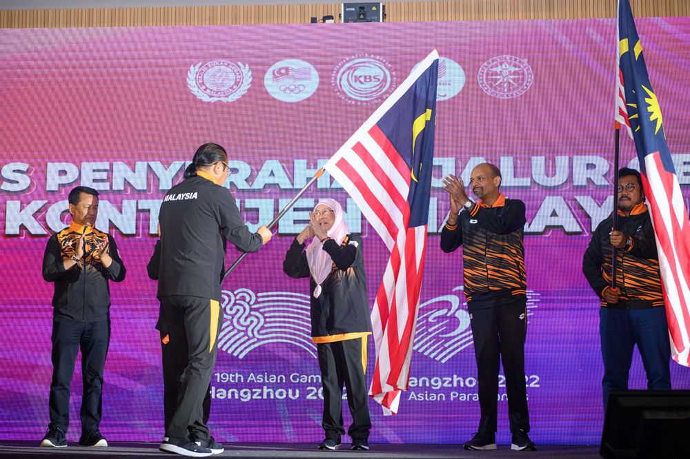 杭州第19届亚运会开幕前夕,马来西亚亚运会代表团和亚洲残疾人运动会代表团11日举行授旗仪式。