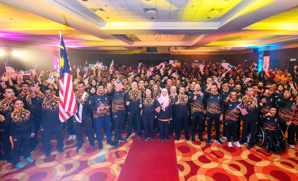 授旗仪式由马来西亚总理夫人旺·阿兹莎主持,马来西亚青年和体育部部长杨巧双、中国驻马来西亚大使欧阳玉靖等出席。旺·阿兹莎在致辞时鼓励马来西亚运动员取得佳绩,亦希望参加本届亚运会能加强马中两国关系,增进双边友谊和往来。图为马来西亚代表团成员在授旗仪式现场。(图片来源:新华社)