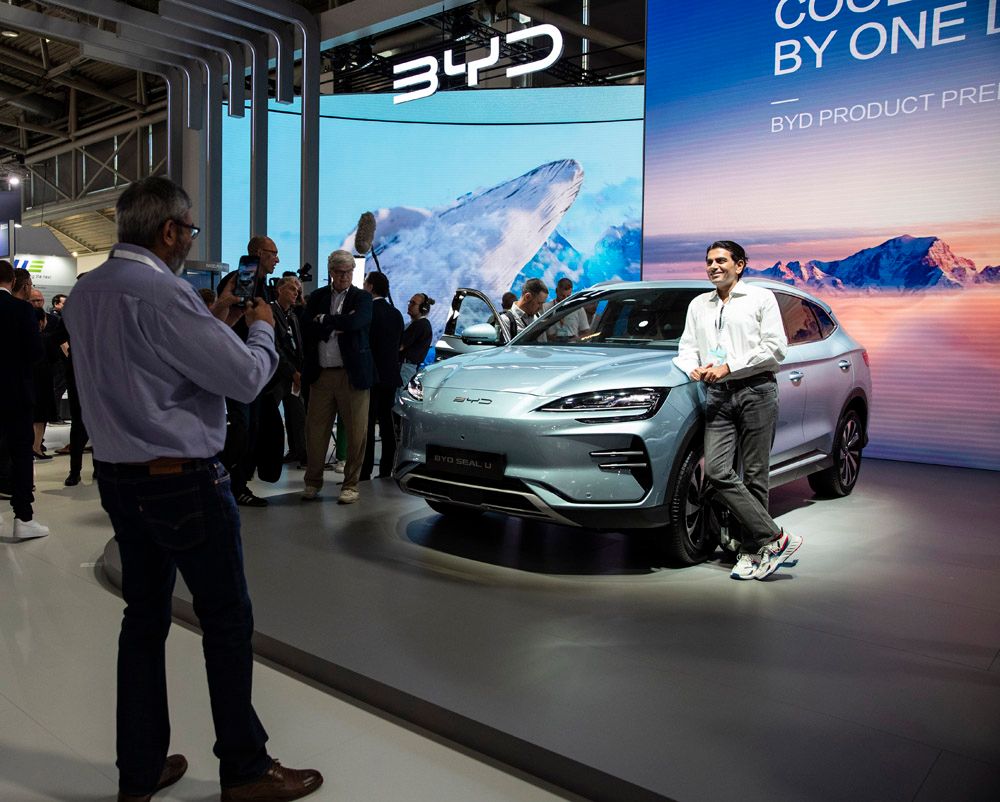 9月4日,在德国慕尼黑国际车展媒体预展上,参观者在比亚迪品牌发布会现场与BYD SEAL U汽车合影。据了解,相比上一届博览会,包括比亚迪、零跑、小鹏、商汤科技等在内的中国展商的数量今年翻了一番。