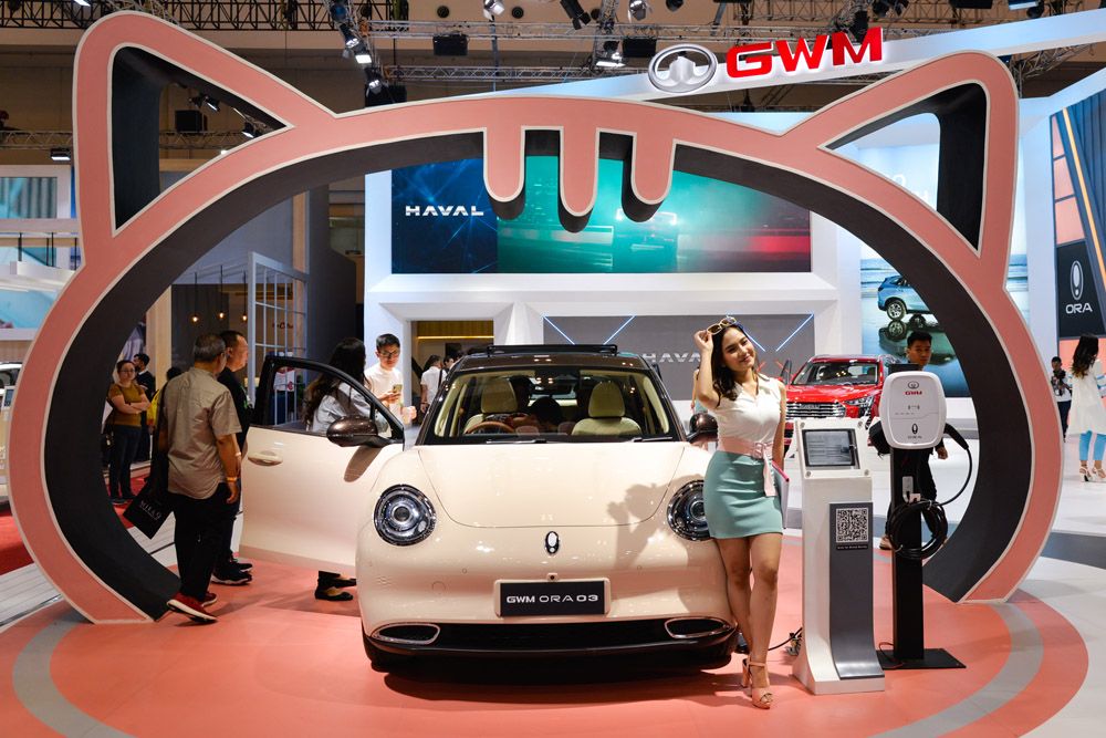 8月14日,在印度尼西亚万丹省唐格朗的印尼会展中心,一名车模在2023年印尼国际汽车展上的中国汽车品牌长城汽车展台展示汽车。在国际汽车展上,中国汽车品牌吸引了众多参观者。印尼是东南亚的汽车生产大国,多家中国车企在此投资设厂。
