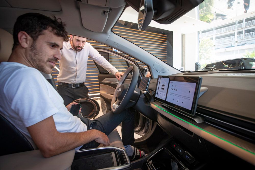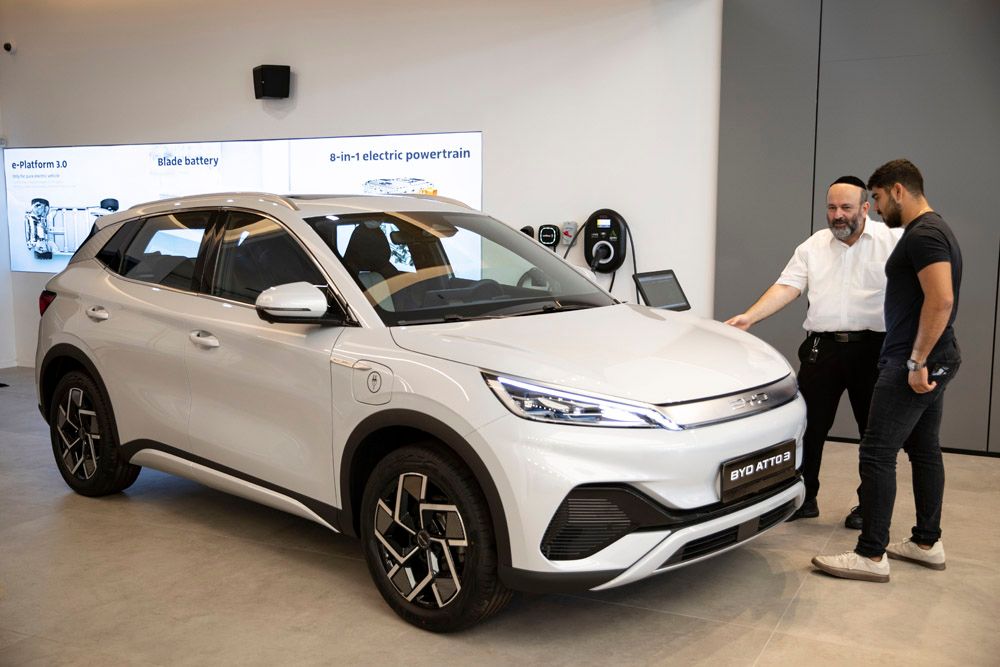 7月17日,在以色列特拉维夫一家比亚迪销售点,顾客咨询SUV Atto 3电动车。2022年,中国车企吉利被以色列汽车杂志评为“年度最佳品牌”,其畅销车型几何C也被评为“年度最佳购买车型”。