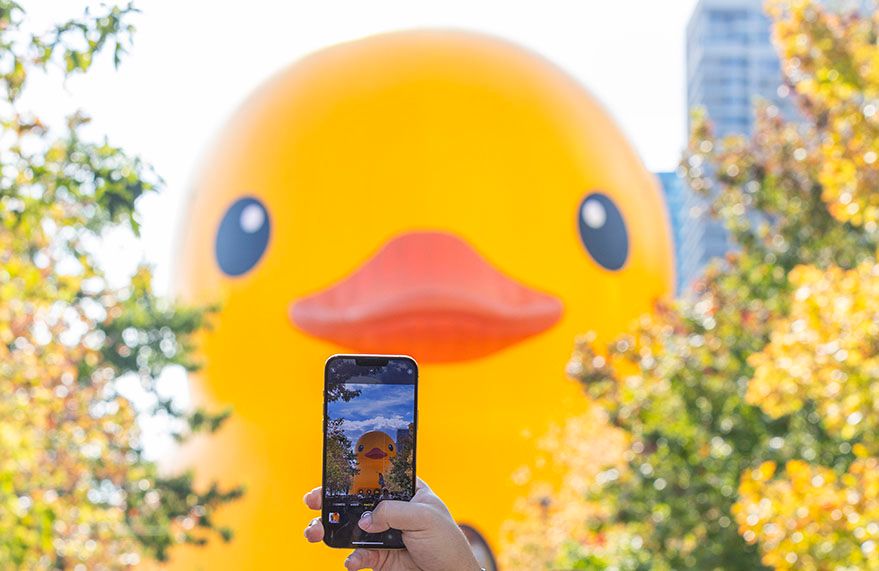9月16日,一名游人在加拿大多伦多拍摄“大黄鸭”。(图片来源:本文图片除标注外均自新华社)