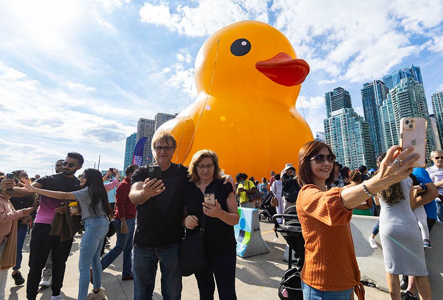 9月16日,游人在加拿大多伦多与“大黄鸭”自拍合影。