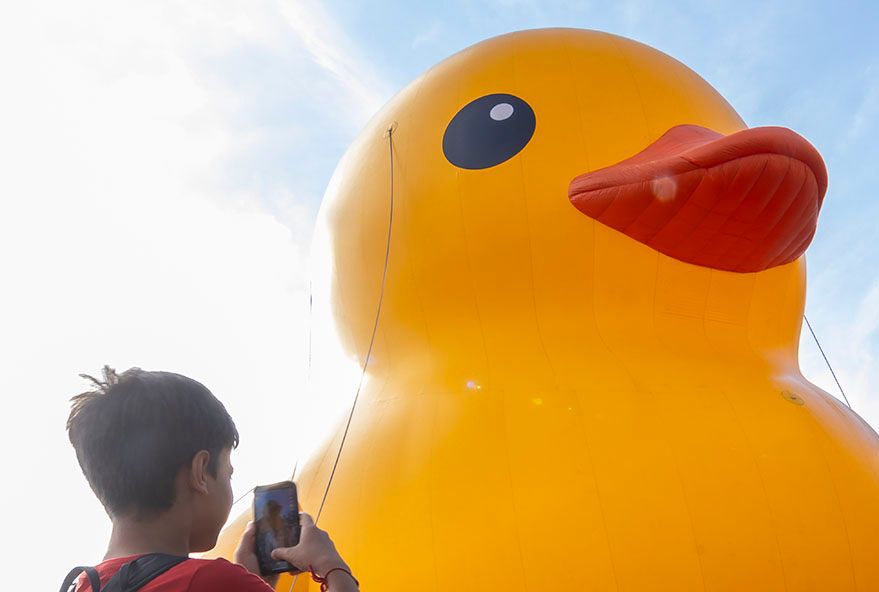 9月16日,一名男孩在加拿大多伦多拍摄“大黄鸭”。