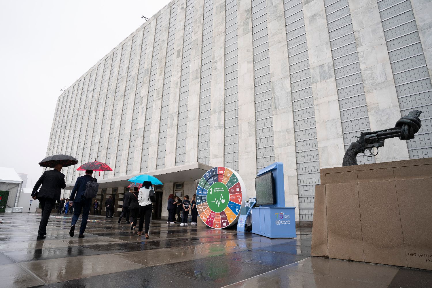 9月18日,与联合国可持续发展目标相关的口号现身纽约联合国总部。(图片来源:中新社)