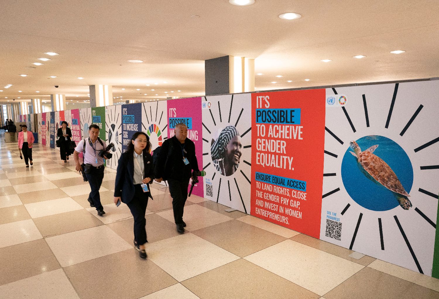 9月18日,人们从纽约联合国总部可持续发展目标主题展板前经过。(图片来源:中新社)