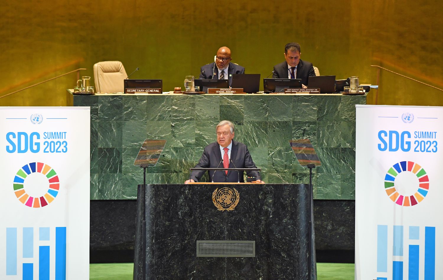 联合国秘书长古特雷斯(前)在联合国可持续发展目标峰会上讲话。(图片来源:新华社)