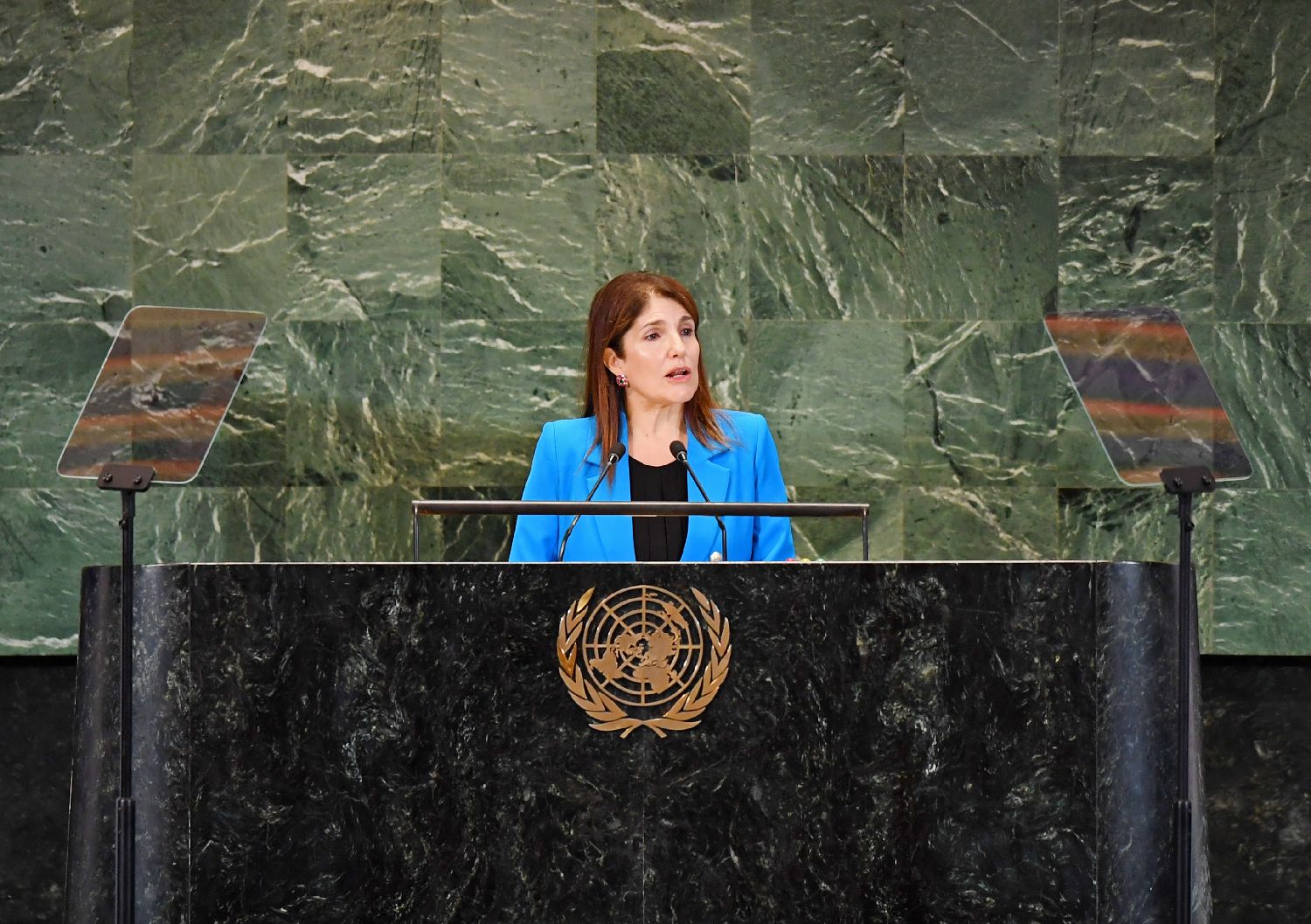 联合国经济和社会理事会主席葆拉·纳瓦埃斯在联合国可持续发展目标峰会上讲话。(图片来源:新华社)