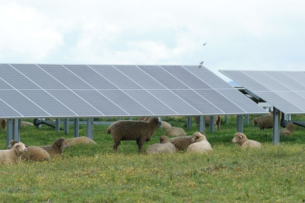 在西班牙卡塞雷斯省的弗朗西斯科·皮萨罗光伏电站,羊群在光伏板周围的花丛休息。