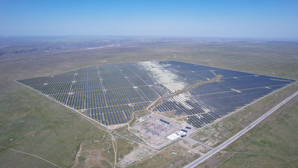 在哈萨克斯坦阿拉木图州拍摄的卡普恰盖100兆瓦光伏电站。阿拉木图州卡普恰盖100兆瓦光伏电站是哈萨克斯坦单体最大的光伏发电项目之一,也是中哈绿色能源合作项目之一,由寰泰能源与哈萨克斯坦合作伙伴投资建设。