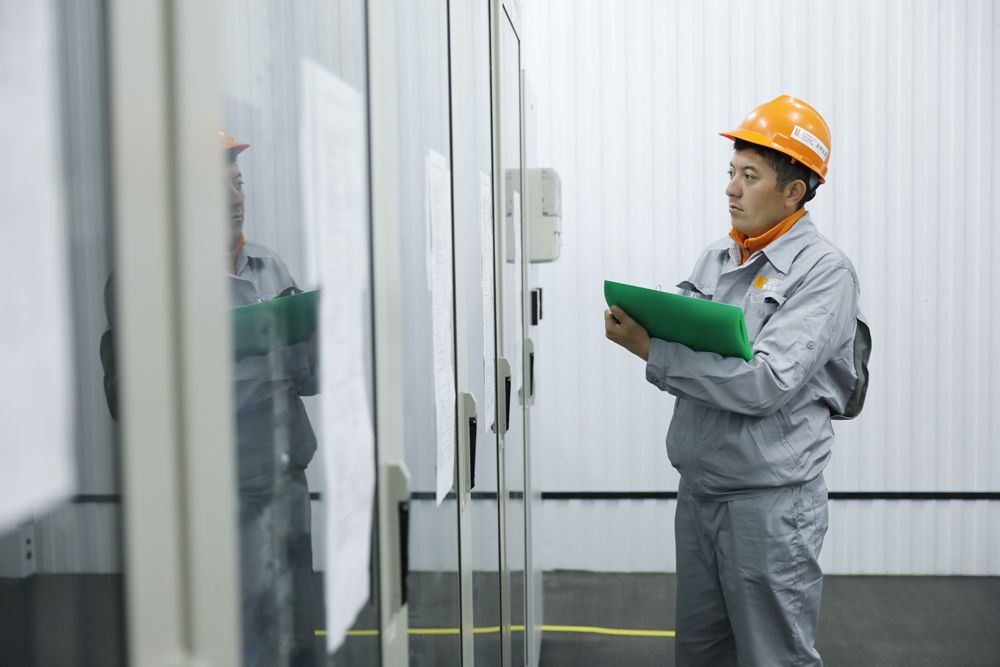 在哈萨克斯坦阿拉木图州,工作人员监控卡普恰盖100兆瓦光伏电站运行情况。