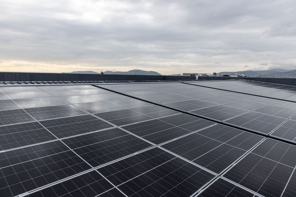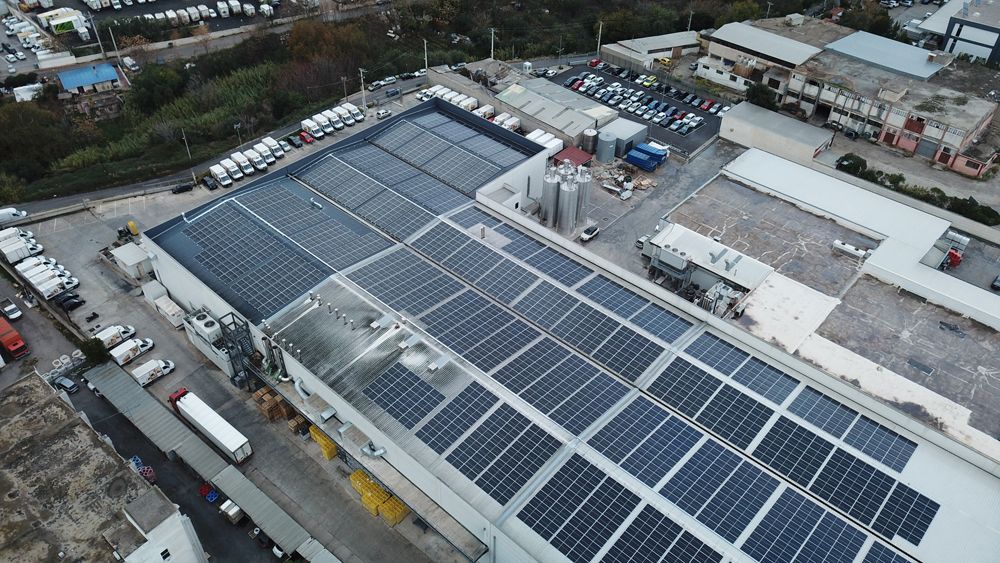 在希腊雅典郊区拍摄的安装在斯泰伊乌家族有限公司工厂屋顶的太阳能面板。希腊糖果及烘焙产品主要生产商斯泰伊乌家族有限公司经理乔治·德利斯表示,公司位于雅典郊区的总部工厂今年夏季安装了光伏并网系统,可满足工厂25%到30%的用电需求。借助项目并网,可将多余能量输送至电力公司抵扣电费,“这不仅降低了工厂造成的环境影响,也降低了运营成本”。
