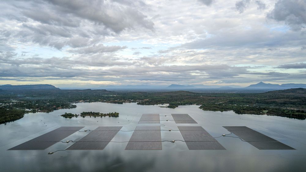 在泰国乌汶府诗琳通水库拍摄的浮体光伏项目。