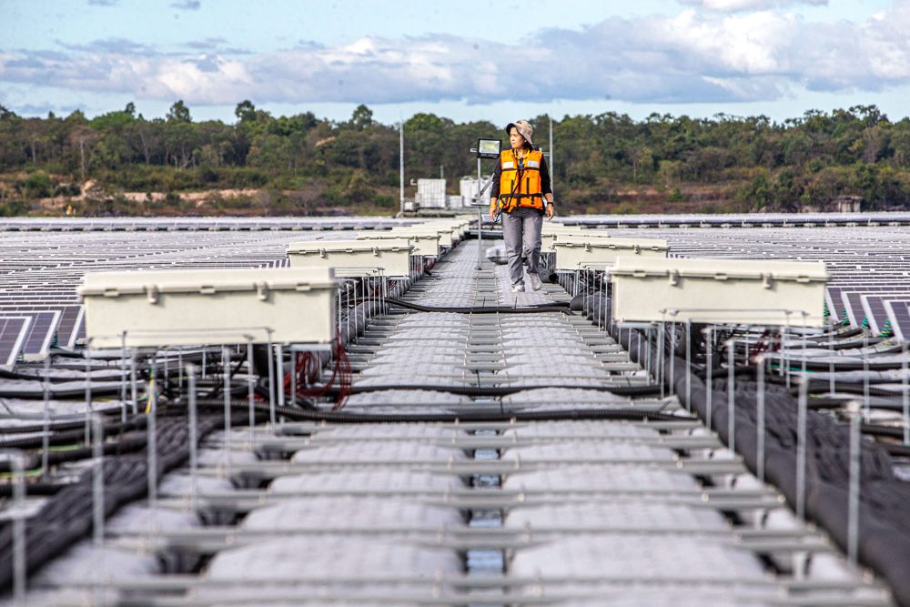 一名工作人员在泰国乌汶府诗琳通水库巡查浮体光伏项目。