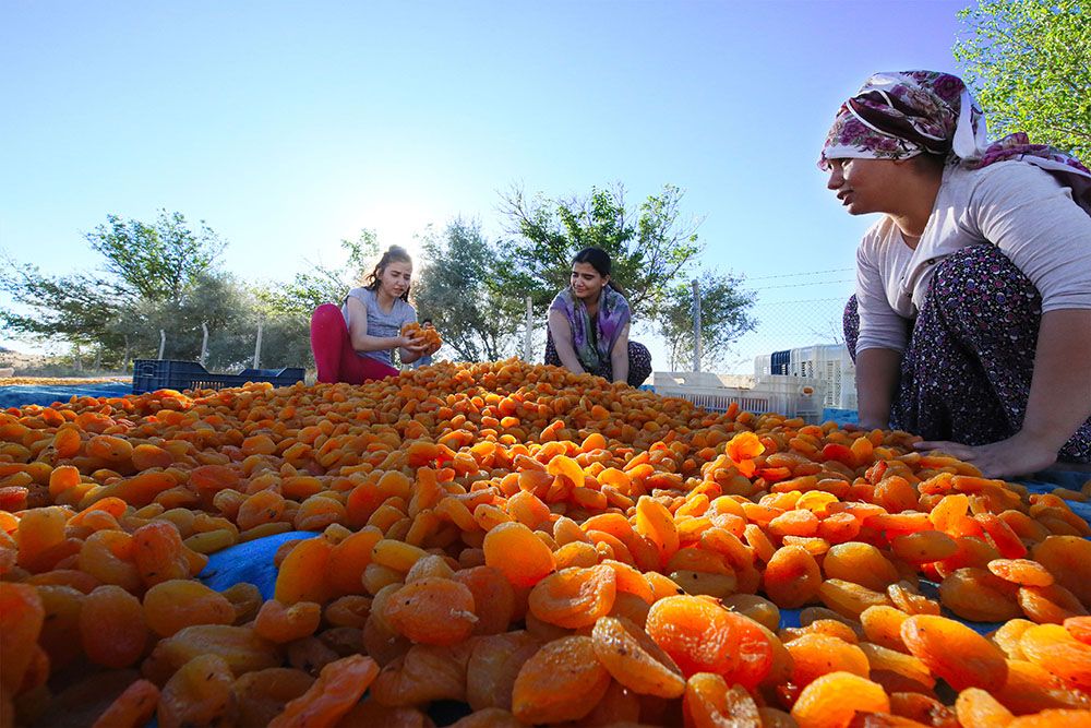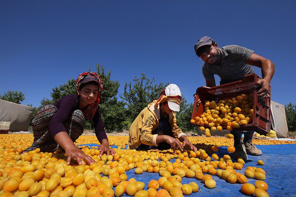在土耳其东部的马拉蒂亚省,农民在田间晾晒刚刚采摘下来的杏子。(图片来源:新华社)