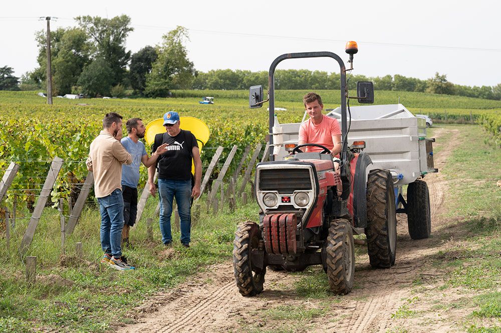 在法国波尔多地区的莱奥尼昂,工人在葡萄园收获葡萄。(图片来源:新华社)