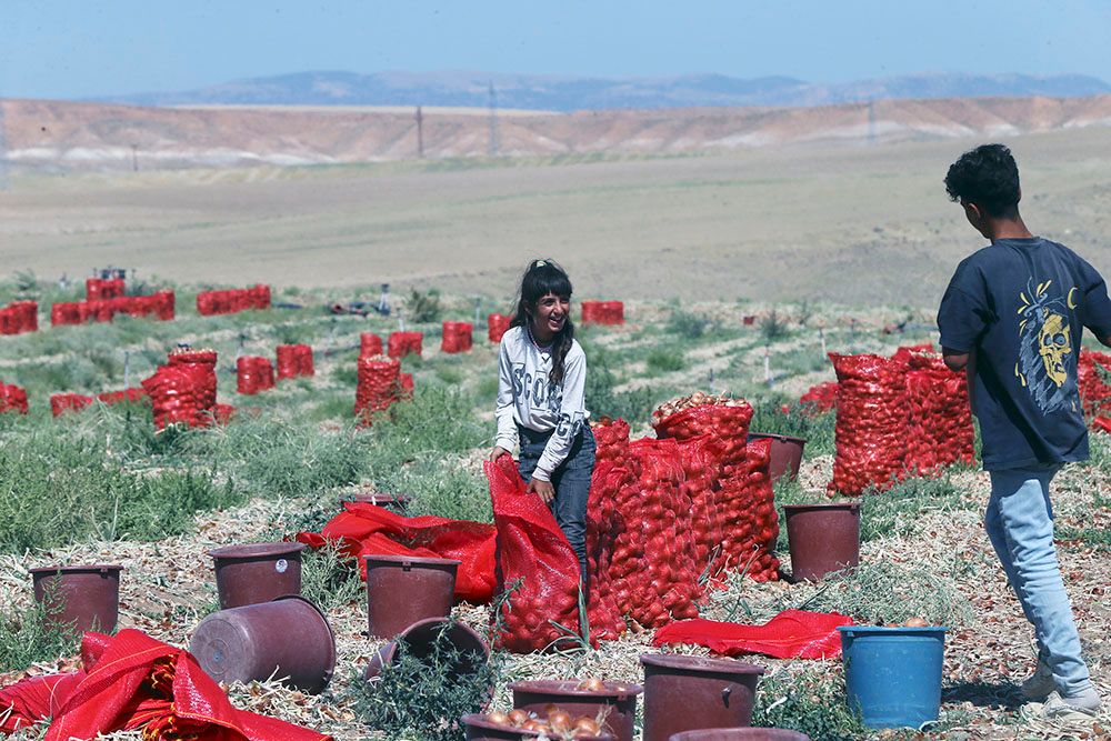 在土耳其安卡拉,人们在田地里收获洋葱。(图片来源:新华社)