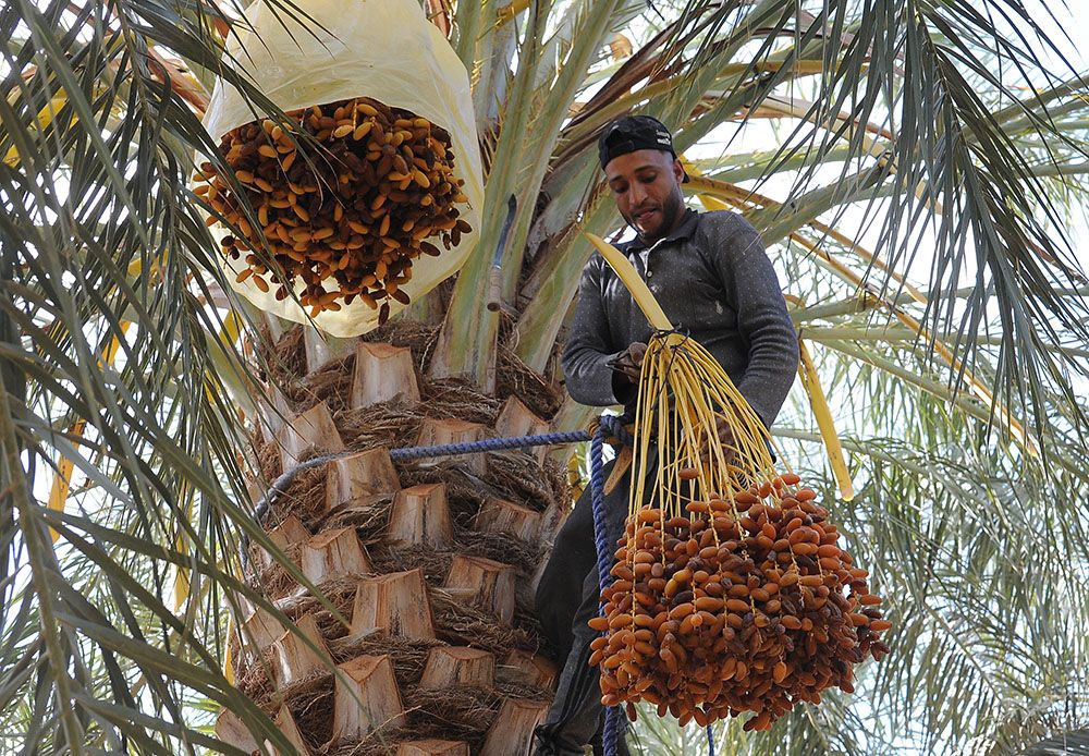 阿尔及利亚比斯克拉省的农民收获椰枣。(图片来源:新华社)
