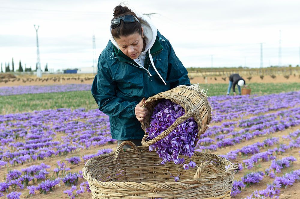 藏红花又称番红花,在西班牙常用于西班牙海鲜饭等菜品烹饪。图为一名女子在西班牙马德里德霍斯的农田里收获藏红花。(图片来源:新华社)