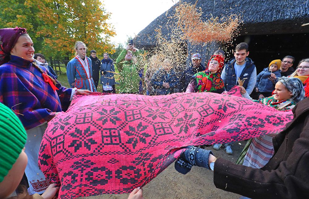 人们在白俄罗斯首都明斯克郊外参加庆祝丰收活动,象征着一年的粮食收割完成,向生长谷物的土地表示感谢。(图片来源:新华社)