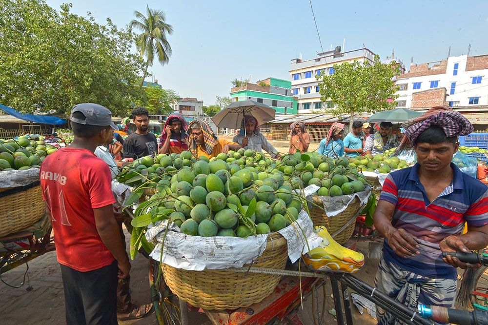 孟加拉国的芒果丰收季,图为当地农民从果园采摘成熟的芒果,装车后运往市场出售。(图片来源:新华社)