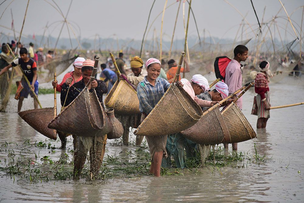 在印度阿萨姆邦一处村庄,当地村民参加捕鱼活动,庆祝丰收节。(图片来源:新华社)