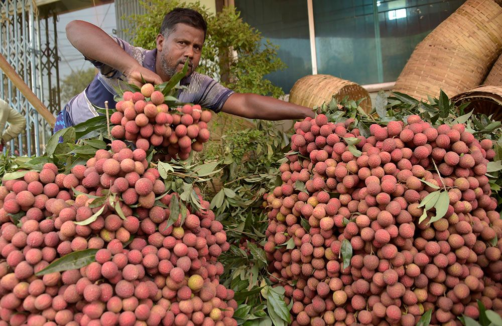 在孟加拉国迪纳杰布尔市场中拍摄的待售的荔枝。(图片来源:新华社)