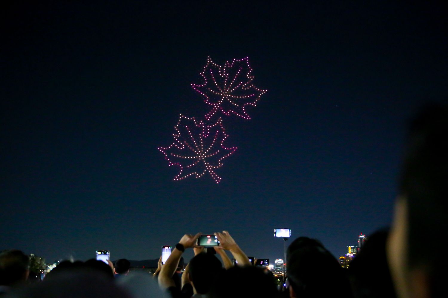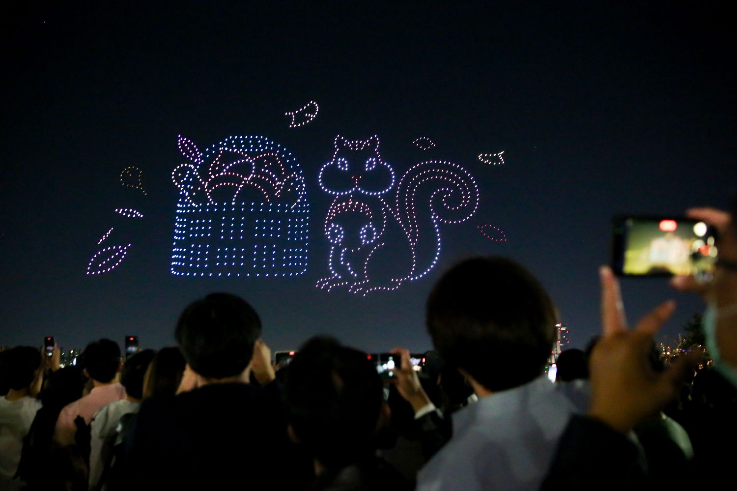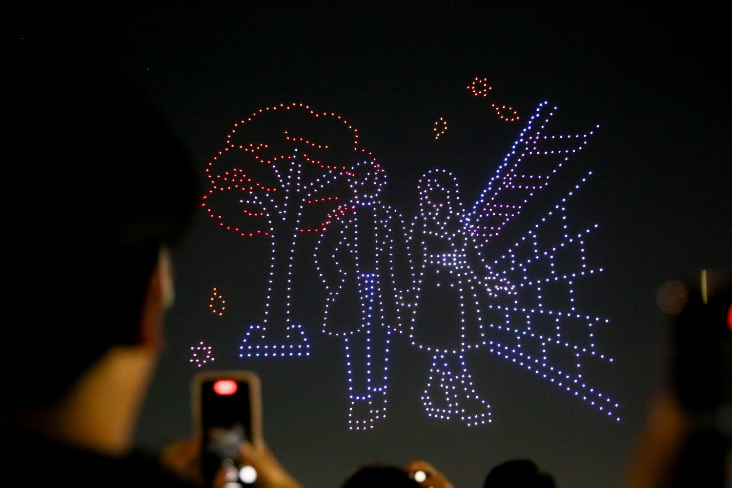 10月1日,1000架无人机在韩国首尔纛岛汉江公园上演一场以“秋天”为主题的灯光秀,吸引众多市民与游客前来观赏。