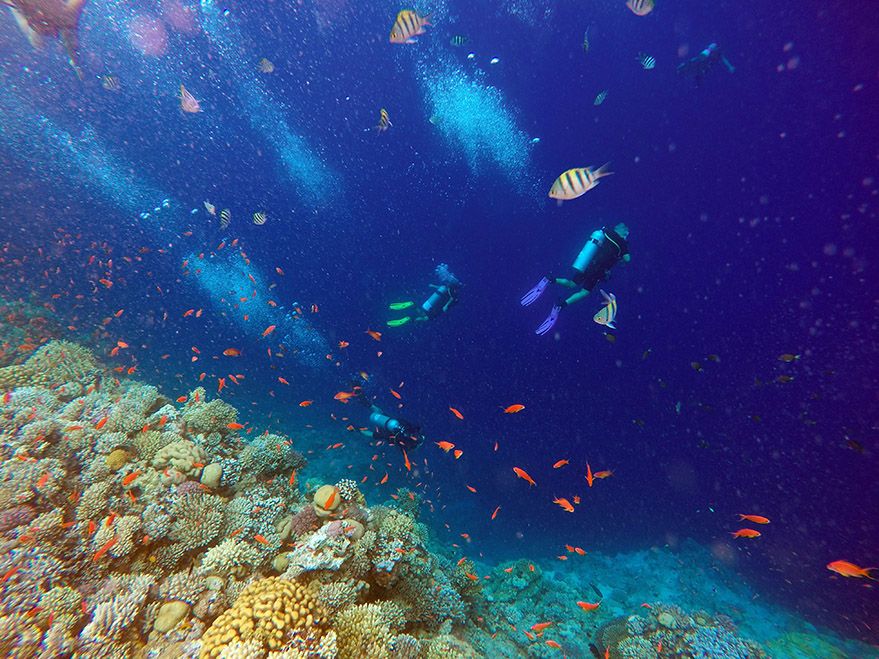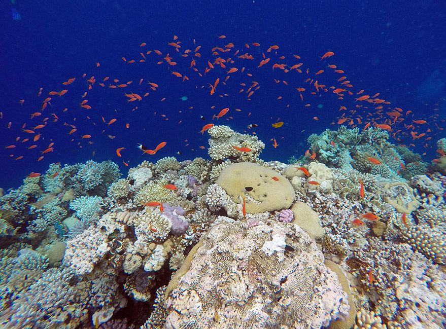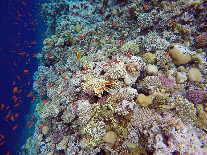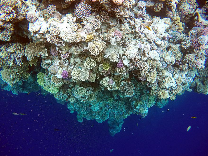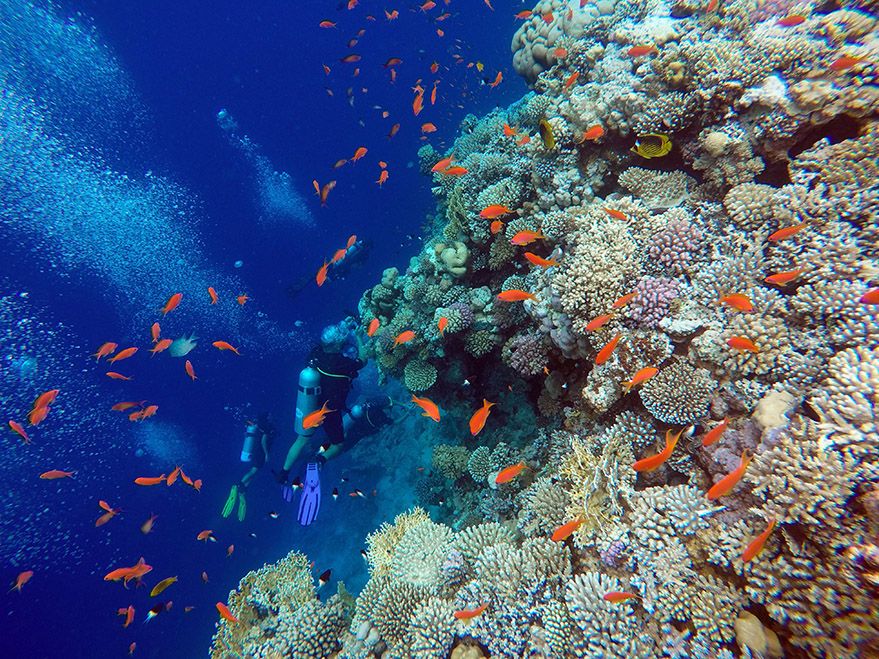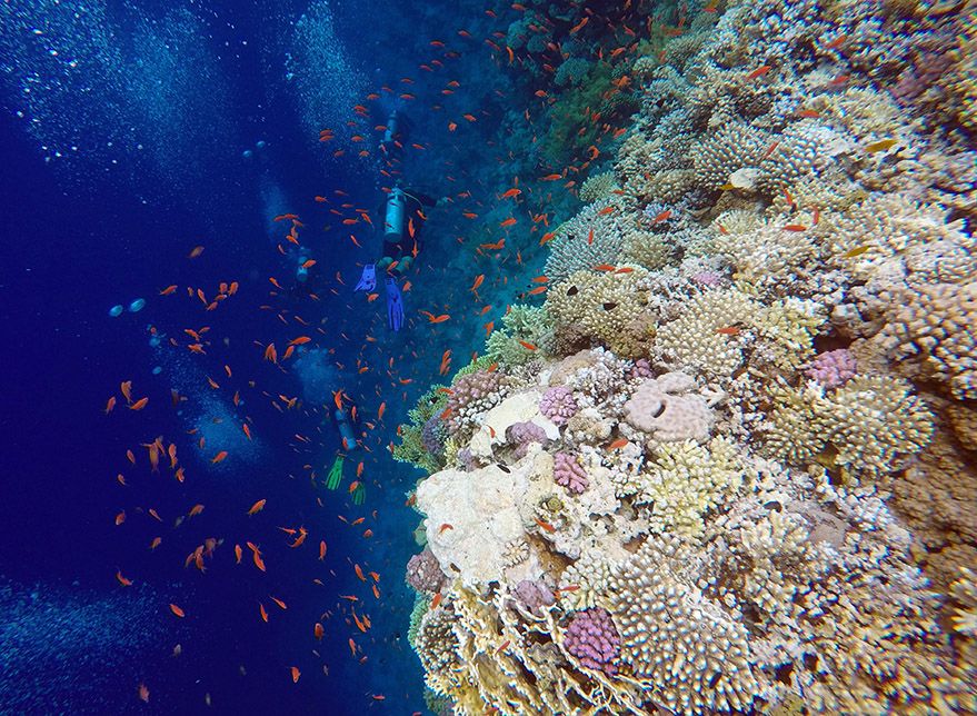 埃及西奈半岛的达哈布蓝洞内拥有大片珊瑚礁和种类繁多的水下生物,每年吸引众多来自全球的潜水爱好者。