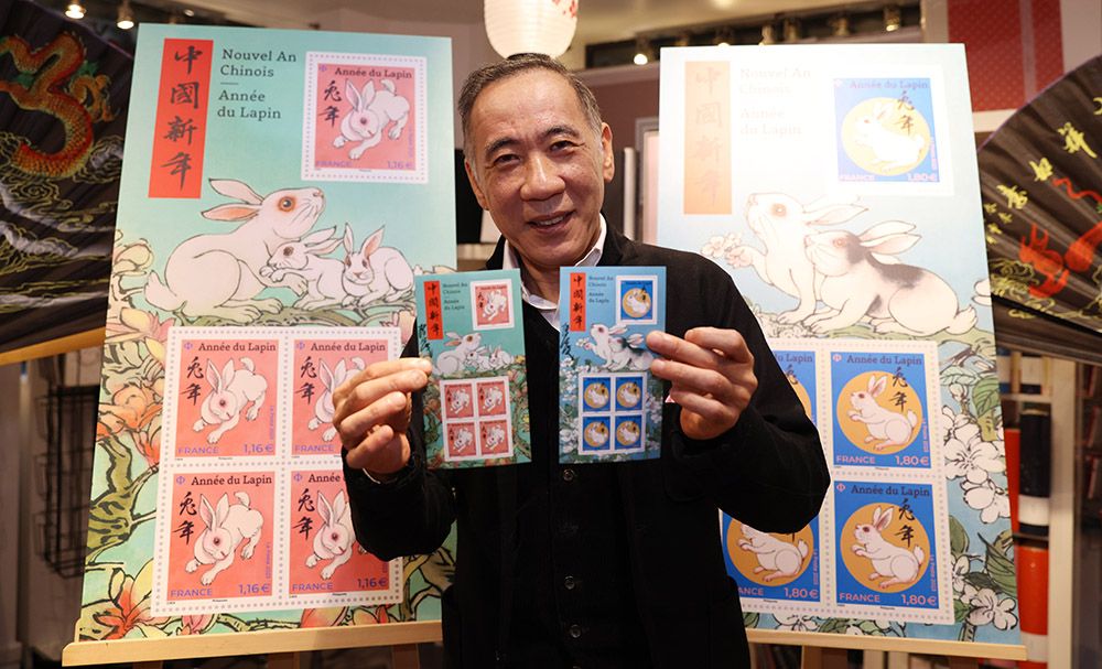 在法国巴黎举行的兔年生肖邮票发行仪式上,邮票设计者陈江洪展示兔年生肖纪念邮票。(图片来源:新华社)