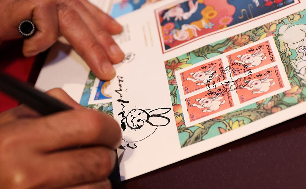 中国兔年生肖纪念邮票共两款,由法国华人艺术家陈江洪设计。(图片来源:新华社)
