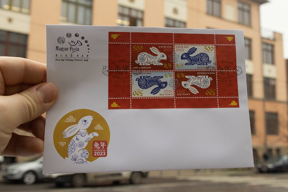 在匈牙利布达佩斯拍摄的中国农历兔年生肖邮票首日封。(图片来源:新华社)