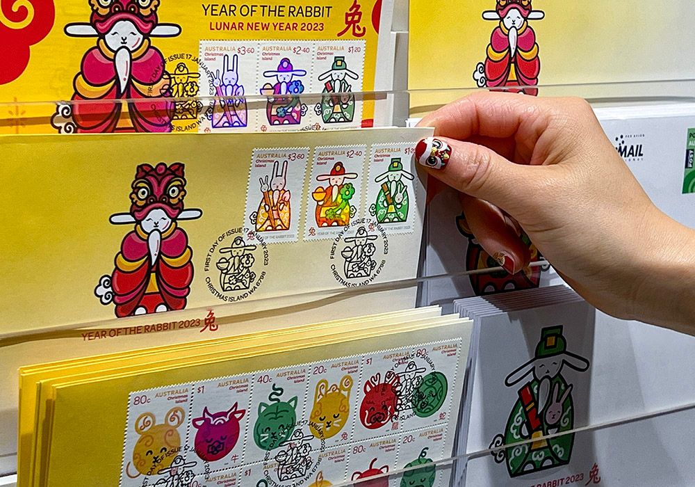 在澳大利亚墨尔本一个邮局拍摄的的兔年生肖邮票。(图片来源:新华社)