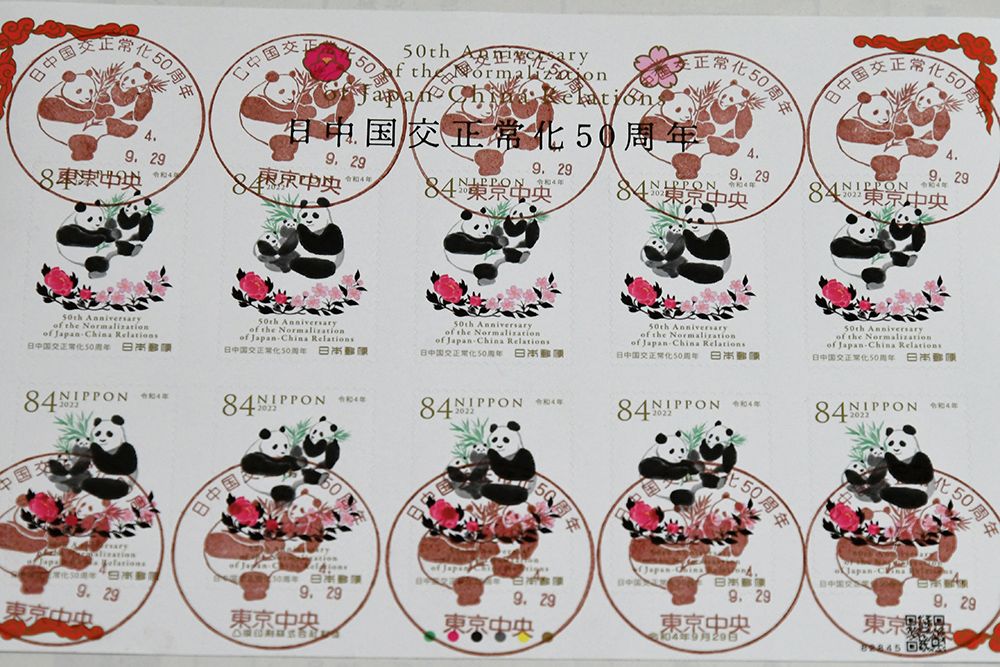在日本东京拍摄的“日中邦交正常化50周年”纪念邮票。(图片来源:新华社)