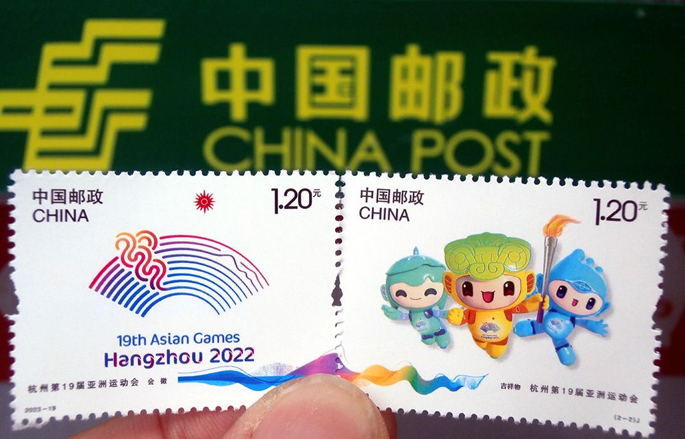 中国江苏苏州:《杭州第19届亚洲运动会》纪念邮票发行。(图片来源:中新社)