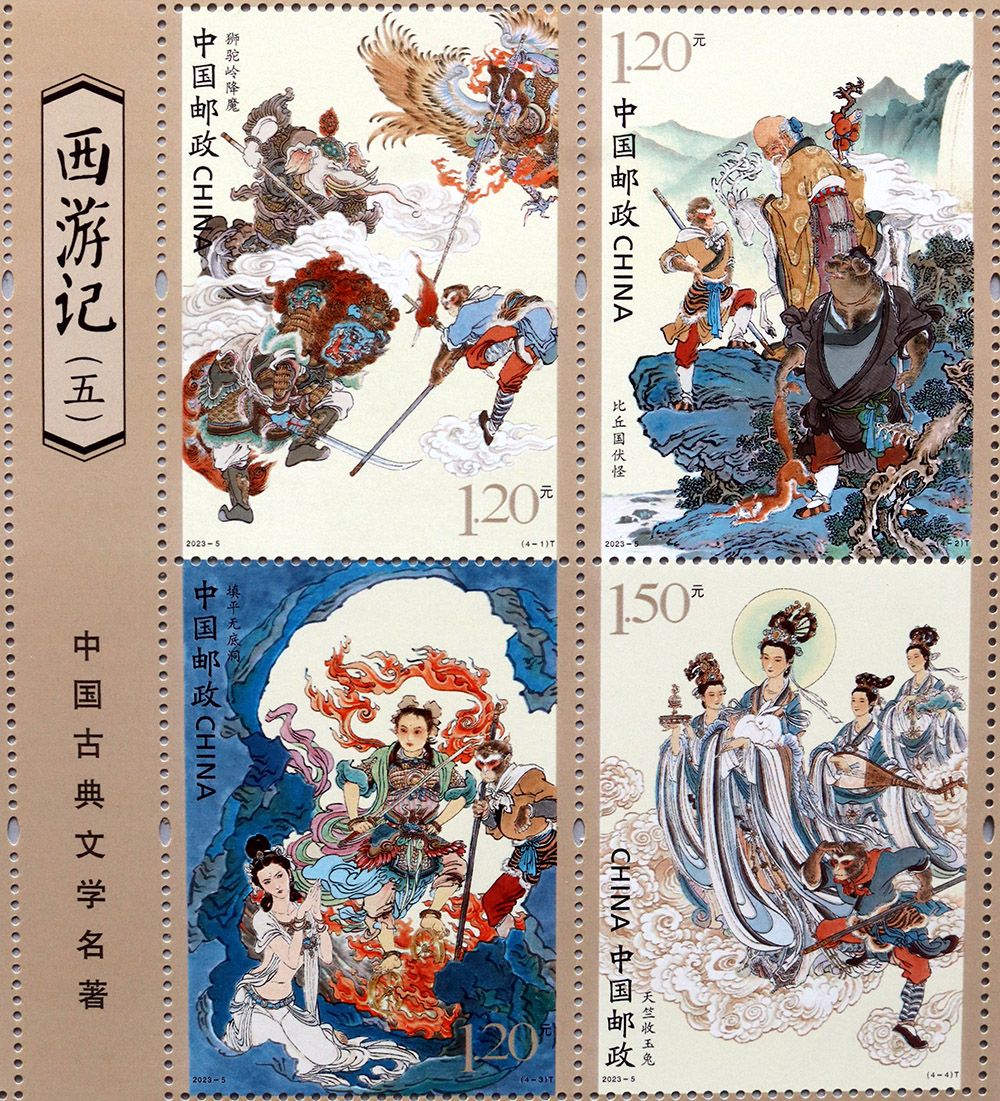 中国邮政发行《中国古典文学名著——<西游记>(五)》特种邮票1套4枚,小型张1枚。(图片来源:中新社)