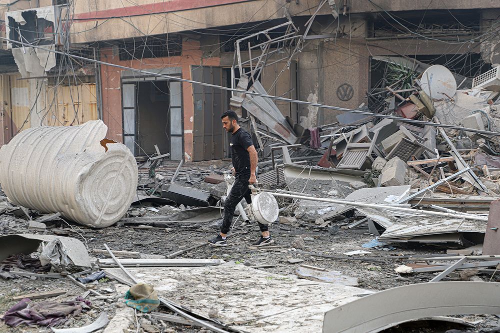 一名巴勒斯坦人从以色列空袭后的建筑废墟中寻找物品。(图片来源:新华社)