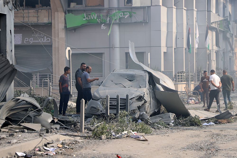 巴勒斯坦人查看被以色列空袭炸毁的汽车。(图片来源:新华社)
