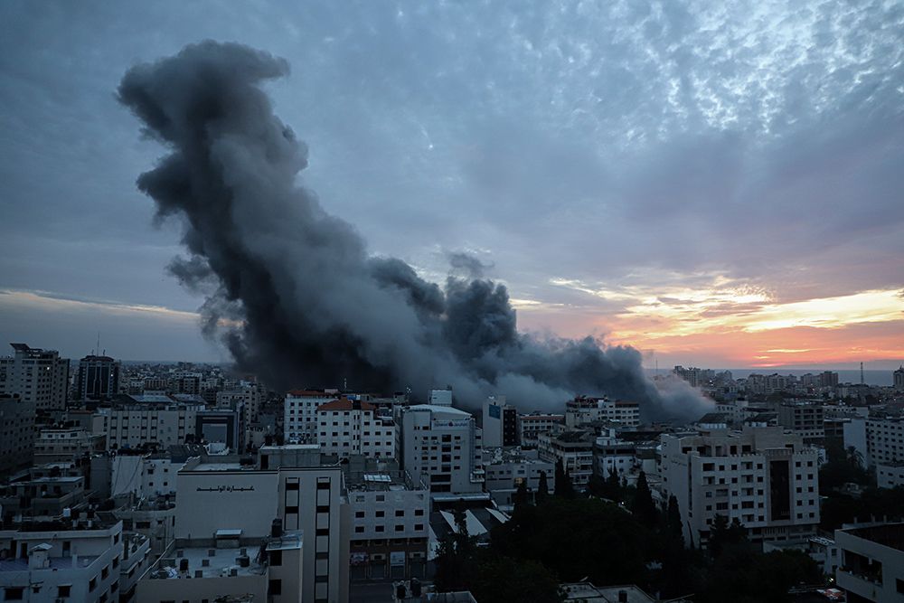 在加沙城拍摄的以色列军队空袭地面建筑造成的浓烟。(图片来源:新华社)