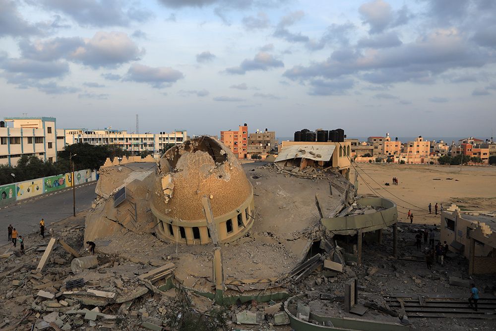 人们站在一座被以色列空袭炸毁的清真寺旁。(图片来源:新华社)