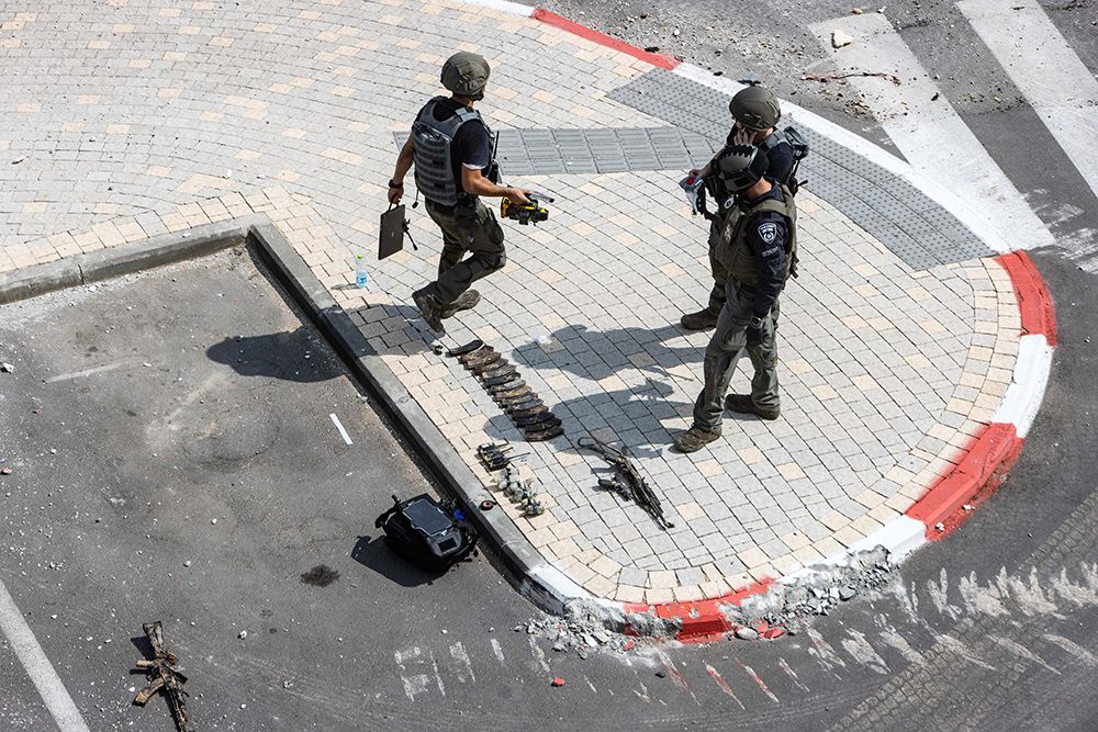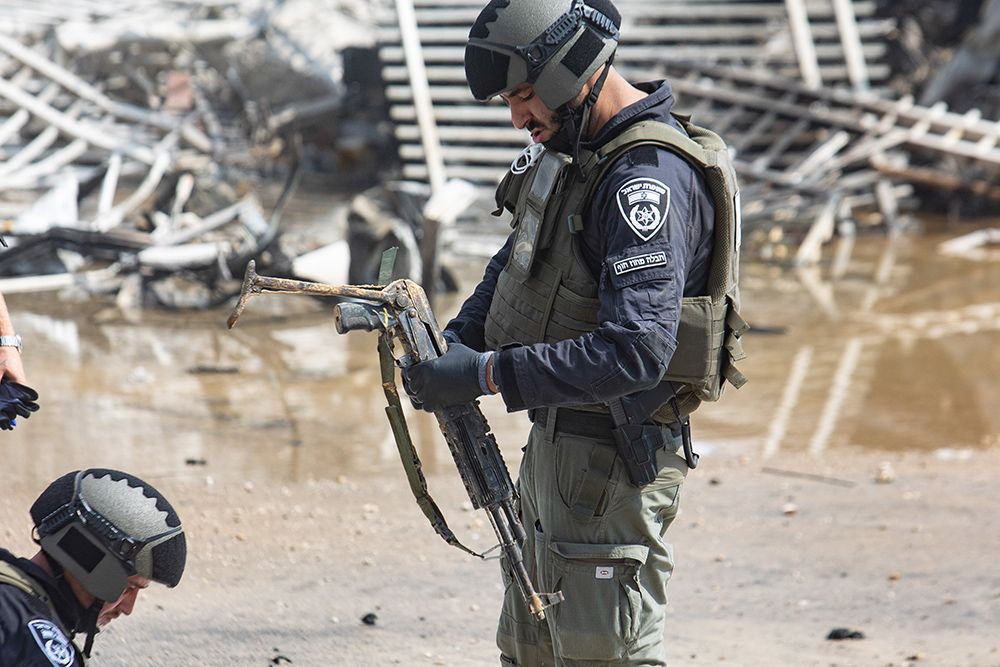以色列警察检查从哈马斯武装人员手中缴获的武器。(图片来源:新华社)