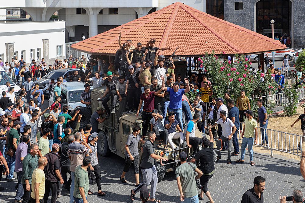 巴勒斯坦人登上一辆以色列军用车辆。(图片来源:新华社)