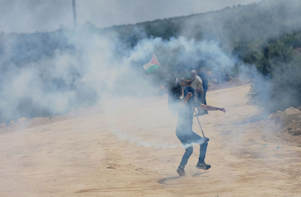 在约旦河西岸城市纳布卢斯,一名以色列士兵投掷催泪弹。(图片来源:新华社)