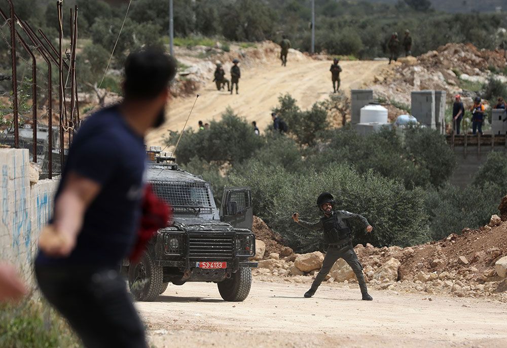 4月10日,在约旦河西岸城市纳布卢斯,巴勒斯坦抗议者与以色列士兵发生冲突。(图片来源:新华社)