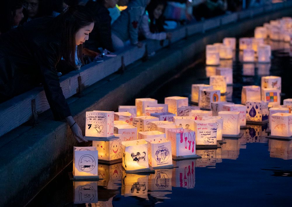 一位女士将水灯放至美国北加州福斯特城一处水面。(中新社)