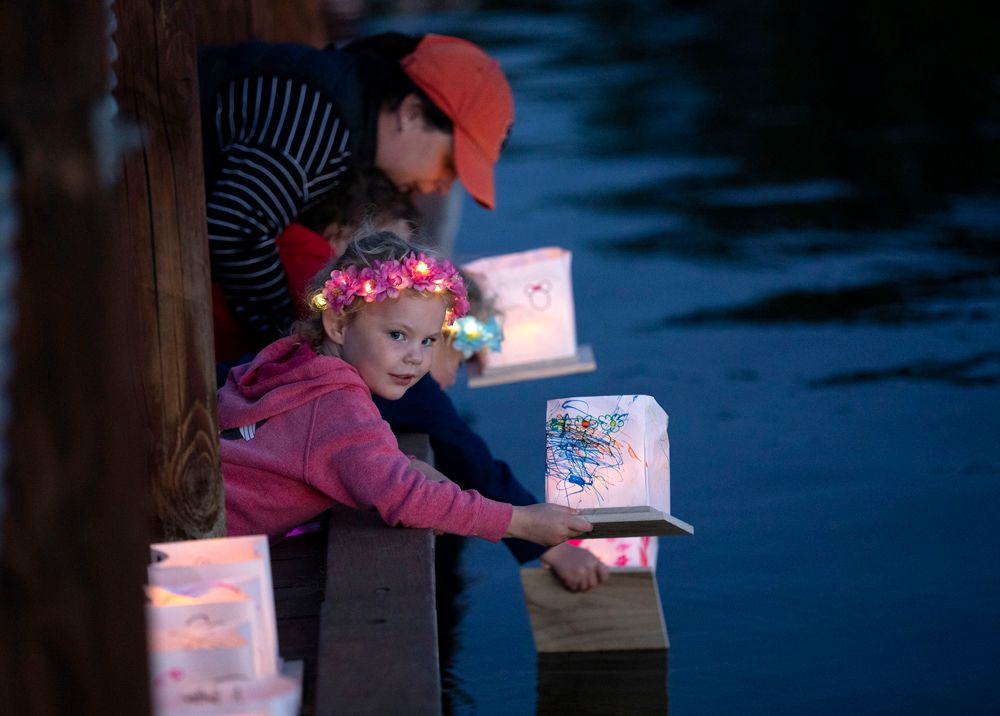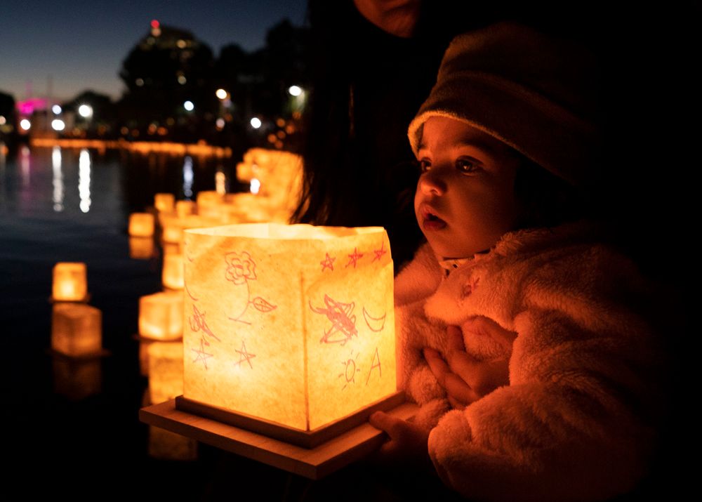 一名儿童准备将水灯放至美国北加州福斯特城一处水面。(中新社)