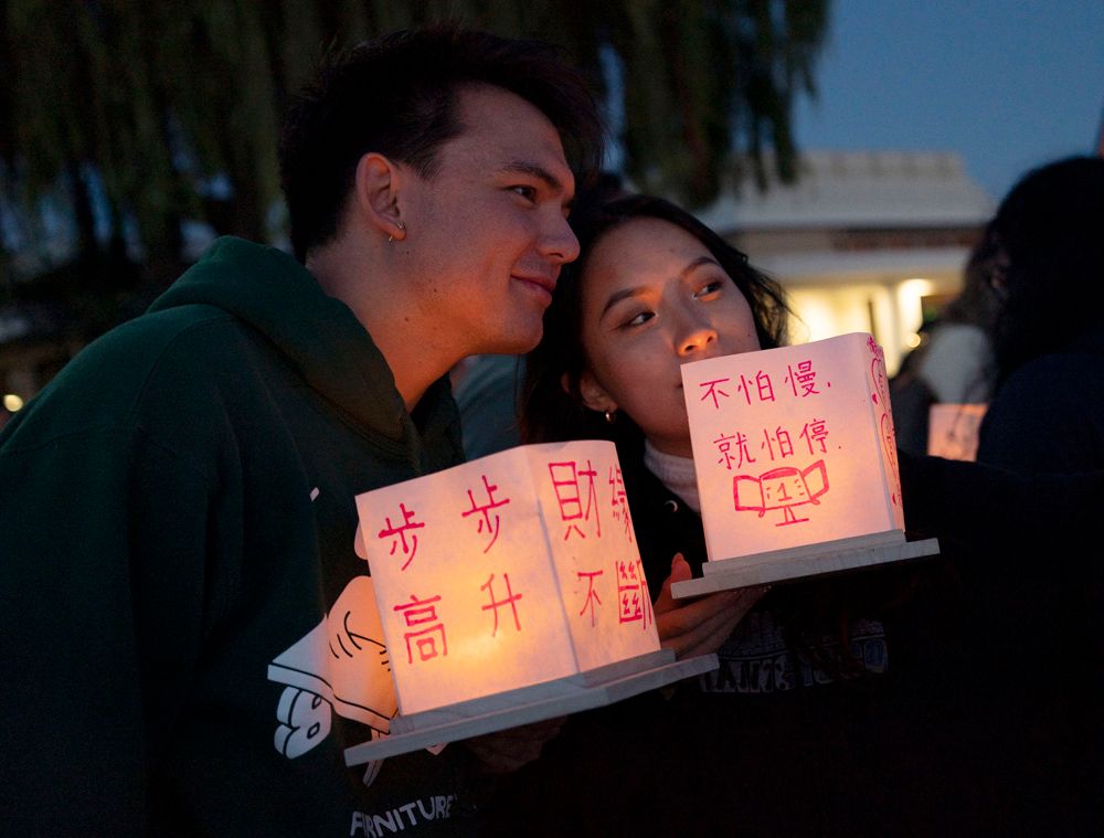 10月8日,在美国加州旧金山湾区福斯特城的水灯节上,民众手捧自己画好的灯笼。(新华社)