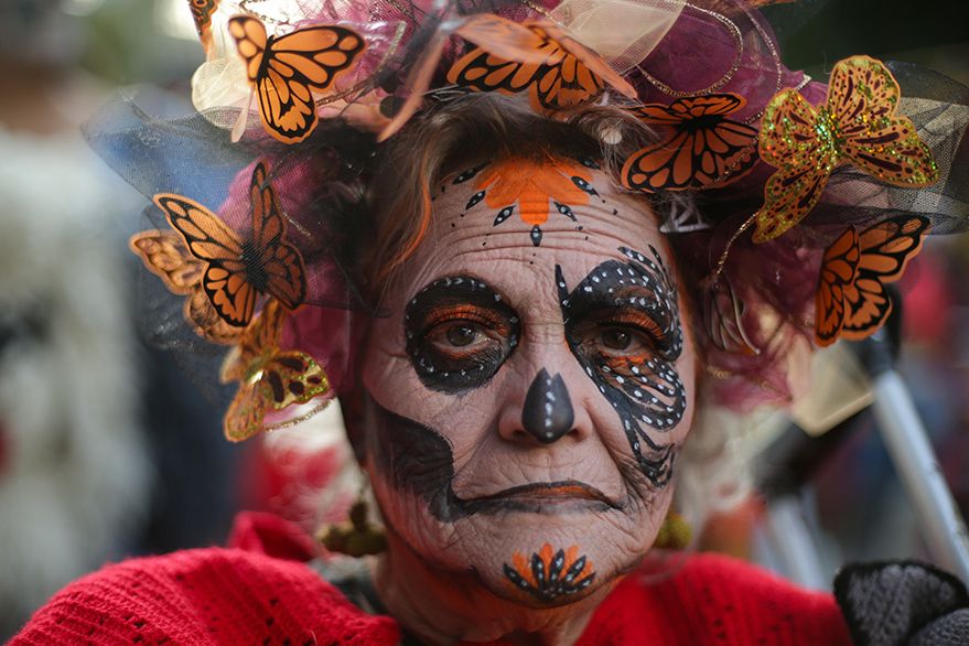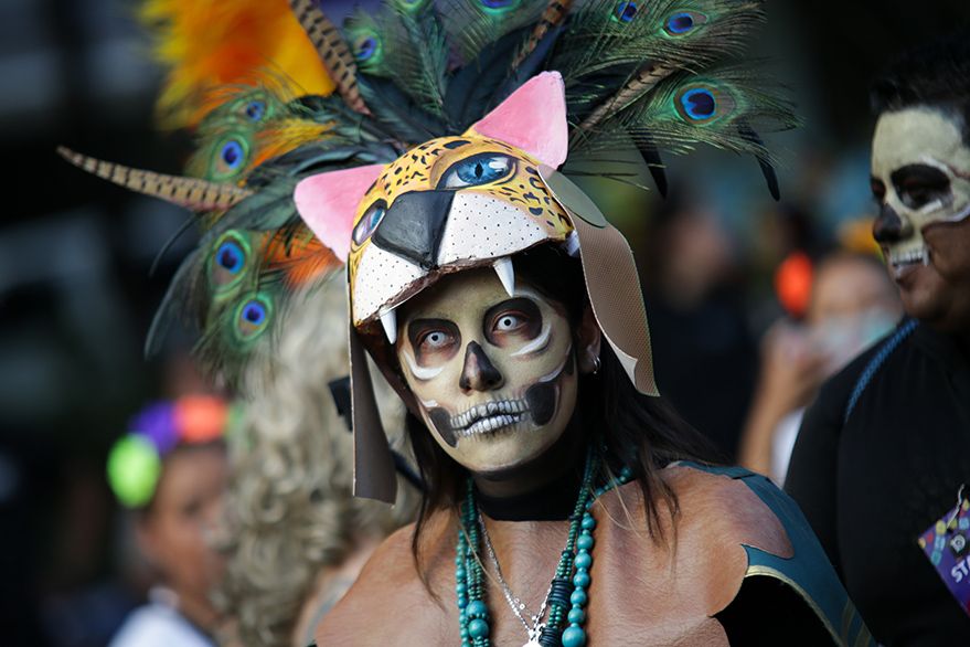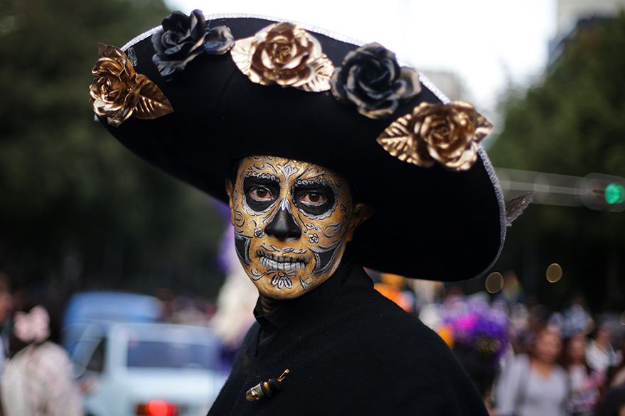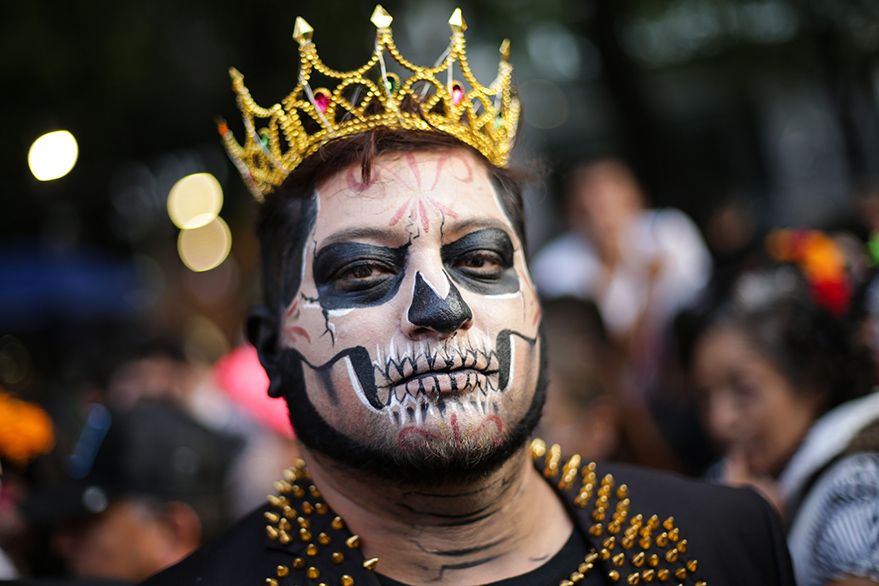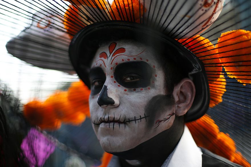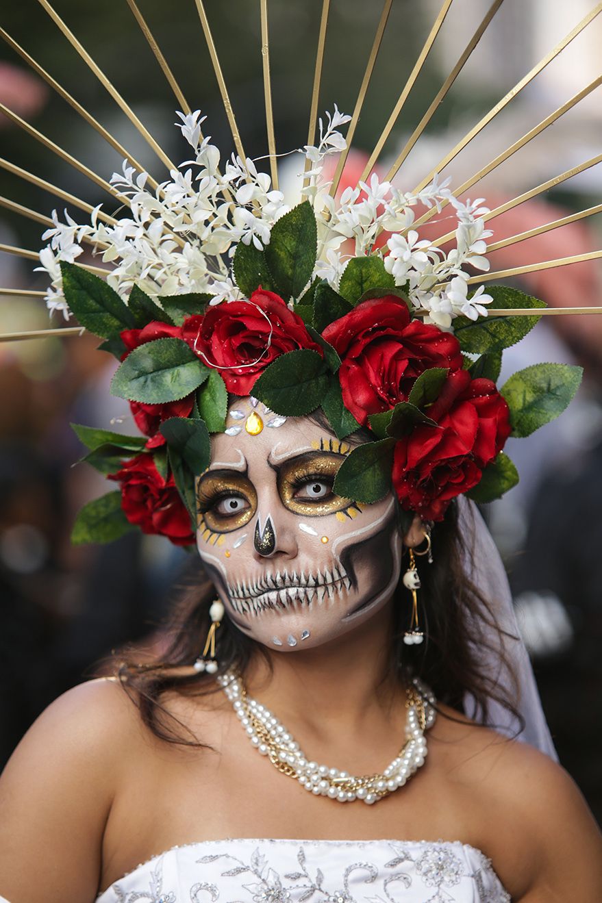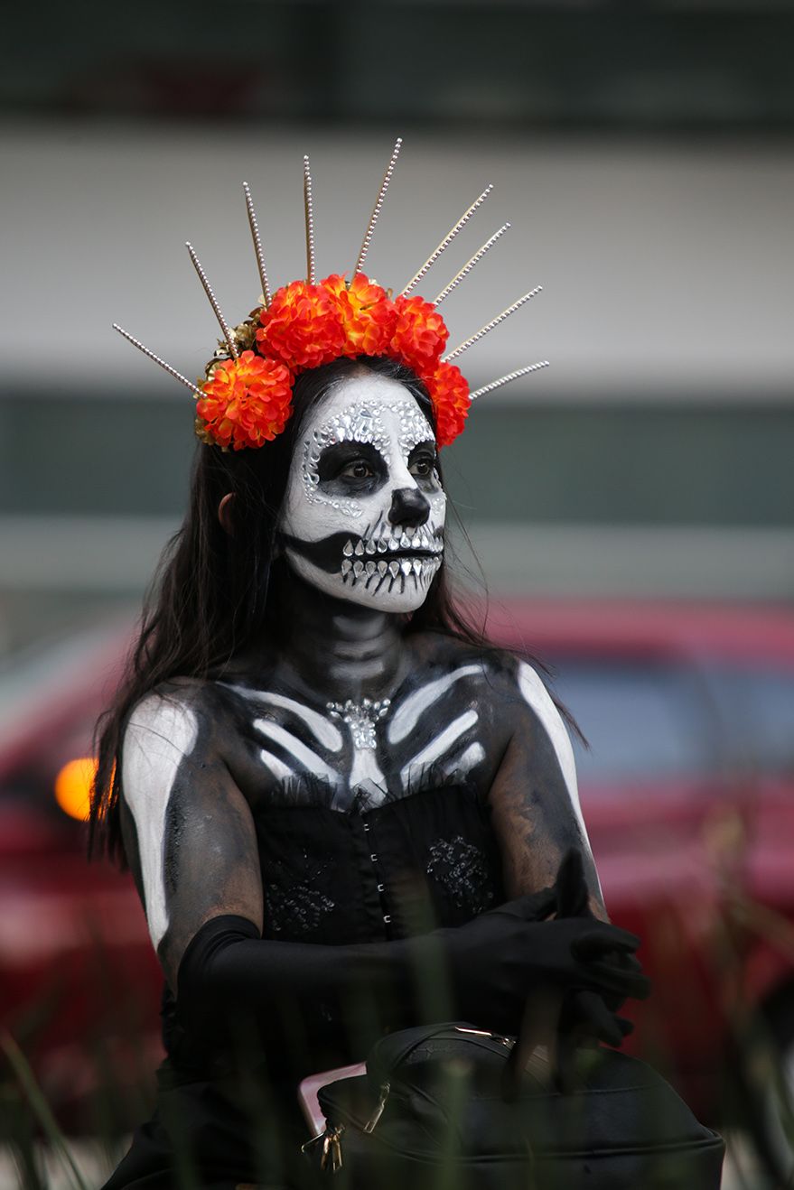 10月22日,在墨西哥首都墨西哥城,一名狂欢者化妆参加“卡特里娜游行”。