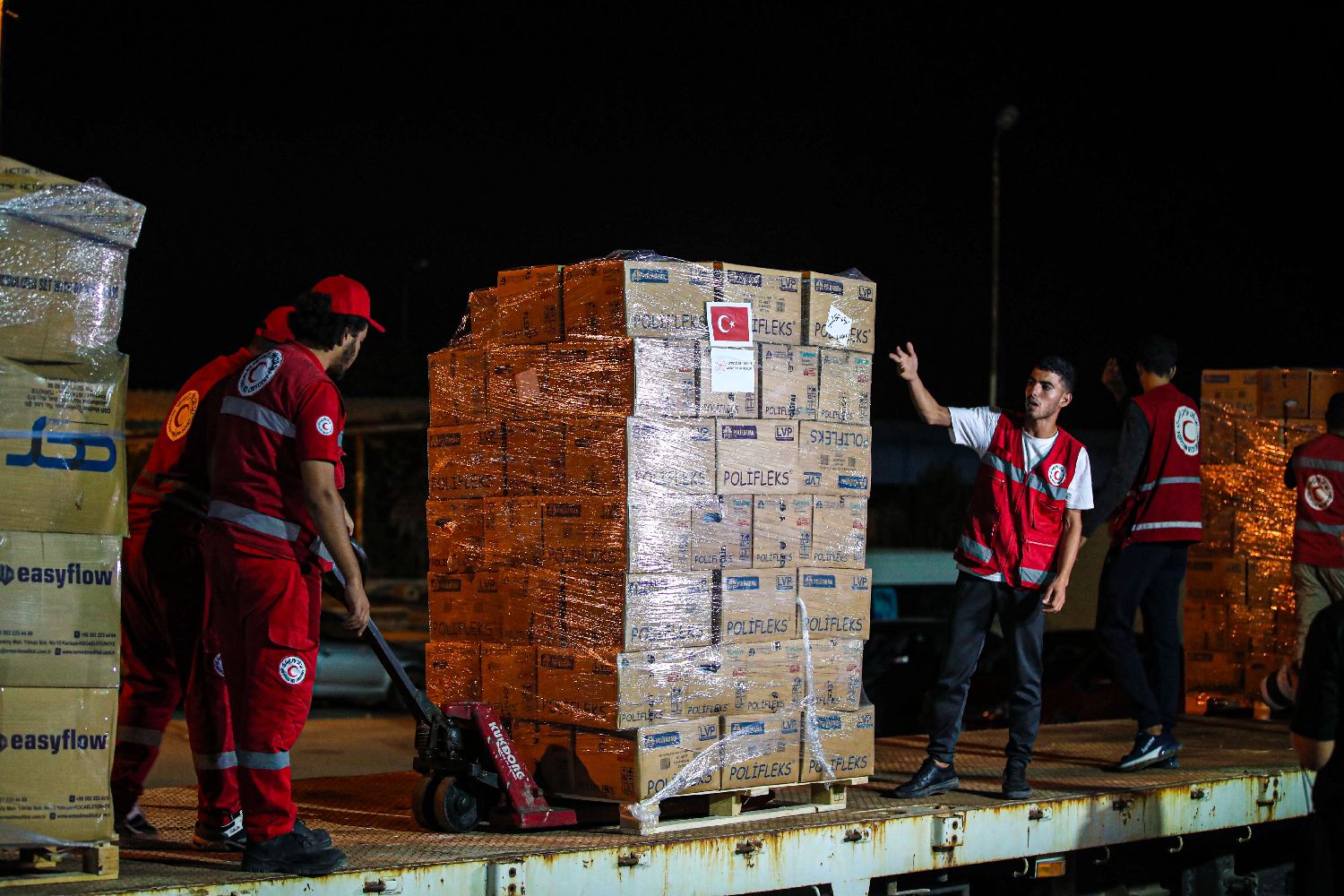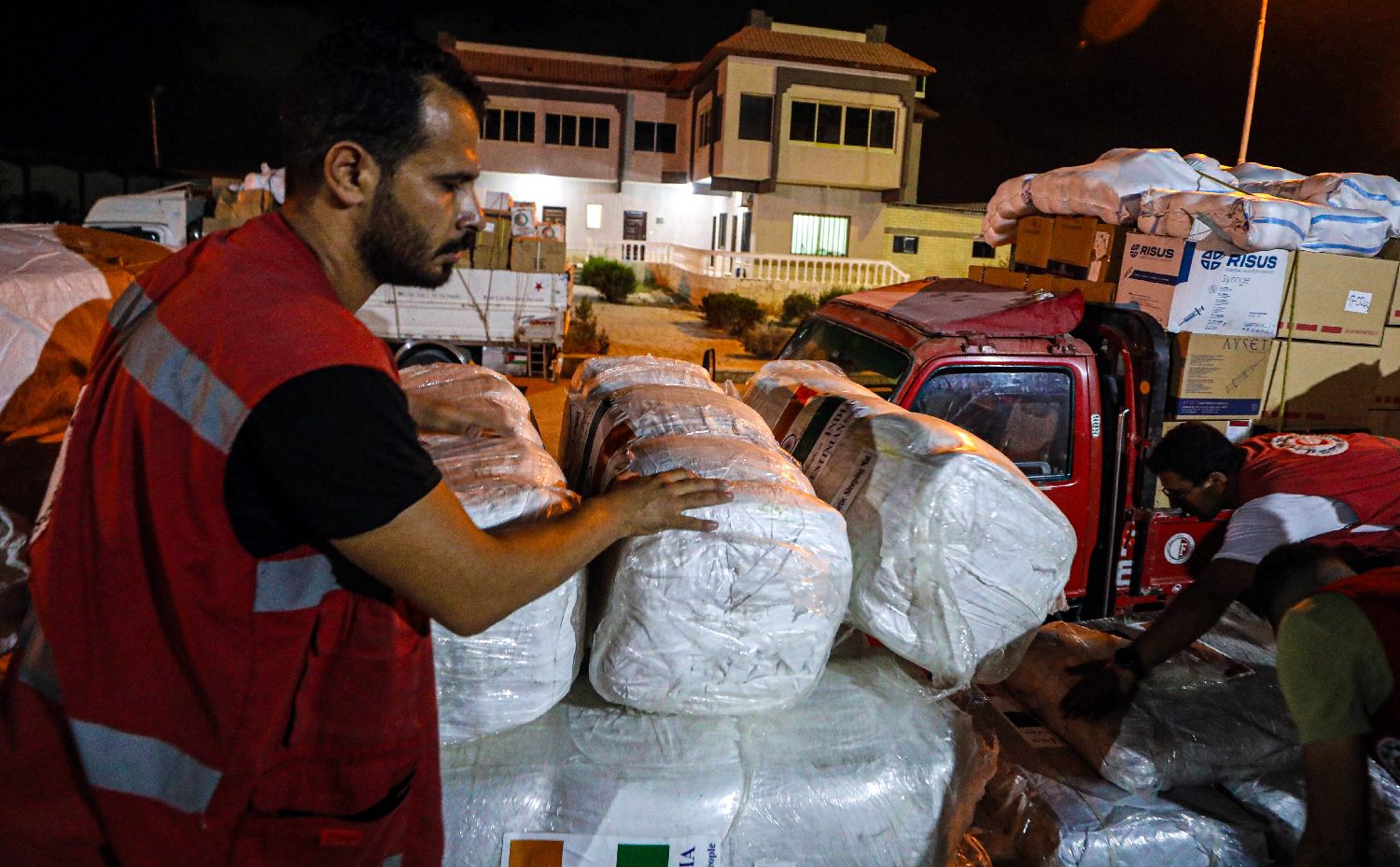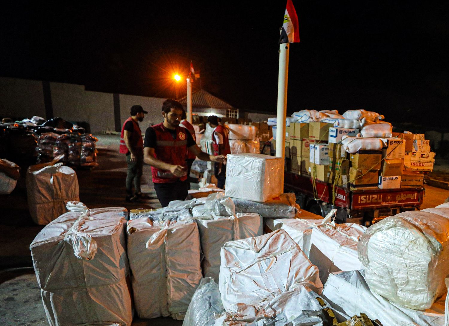 10月23日,在埃及阿里什市一处仓库,埃及红新月会的工作人员搬运救援物资。