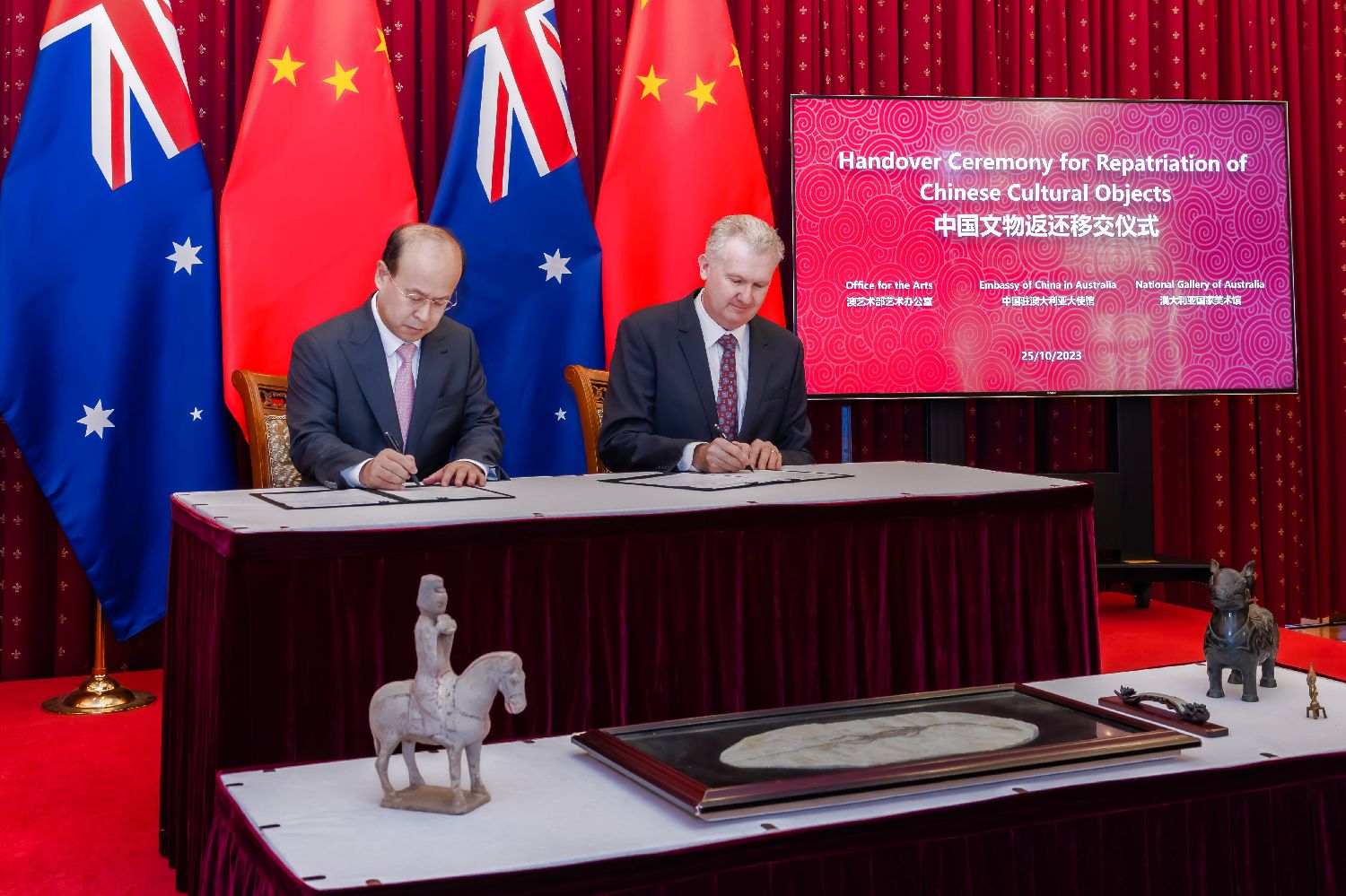 10月25日,经国家文物局授权,中国驻澳大利亚大使馆举行仪式,接收澳方向中国返还的4件流失文物艺术品与一件古生物化石。